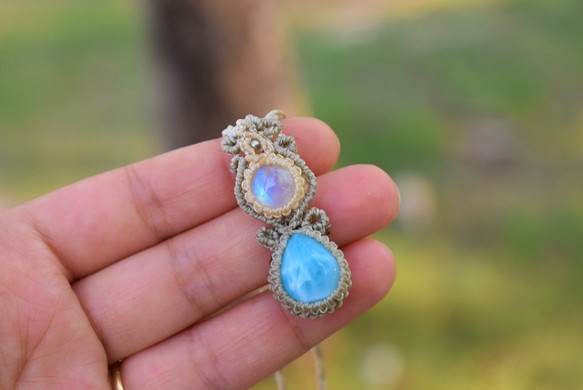 小粒★高品質★ラリマーとホワイトラブラドライト マクラメペンダント
